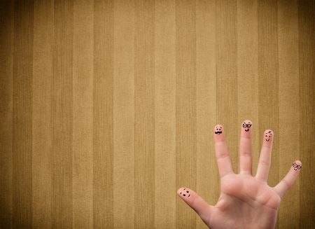 Happy finger smileys faces on hand with vintage stripe wallpaper background