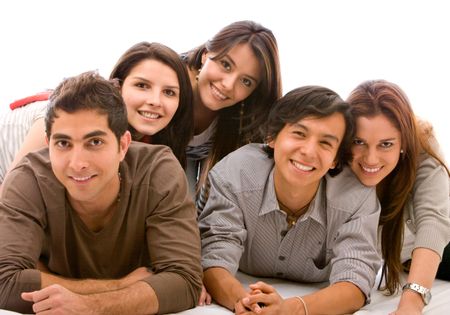 Happy friends with their heads together on the floor isolated