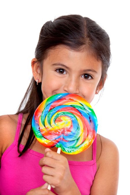 Happy girl with a colorful candy isolated on white