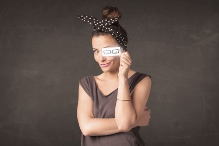 Happy girl looking with hand drawn eye glasses paper concept