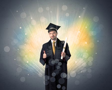 Happy graduate with colorful bokeg lights in the background grunge wall