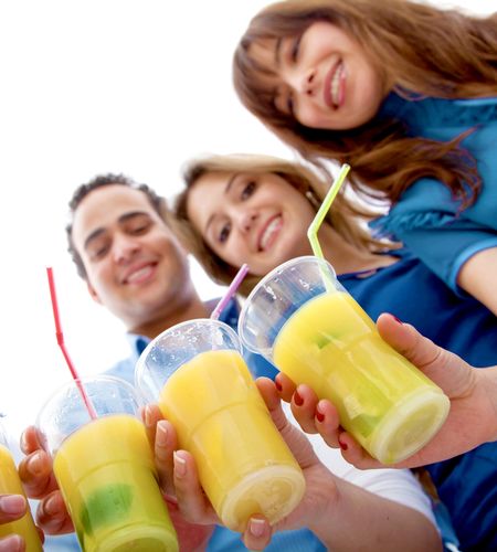 Happy group of friends having a drink isolated on white