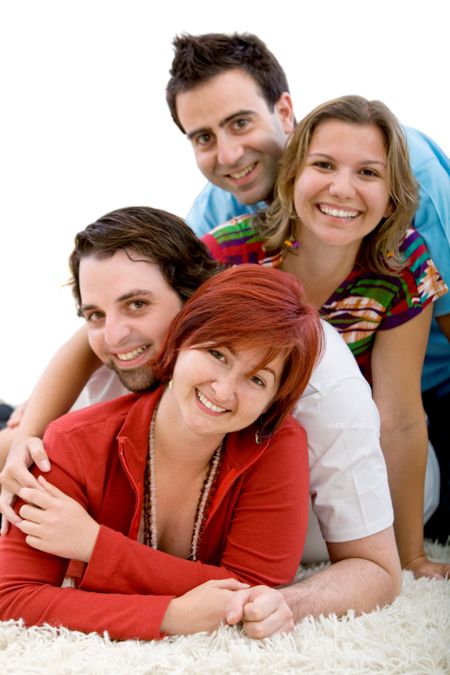 Happy group of friends lying on the floor isolated