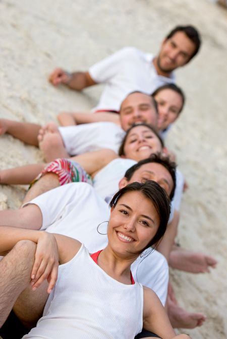 Happy group of friends smiling at the beach