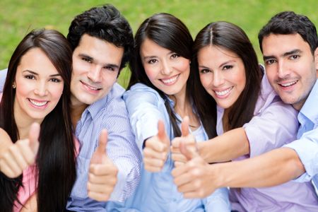 Happy group of friends with thumbs up outdoors