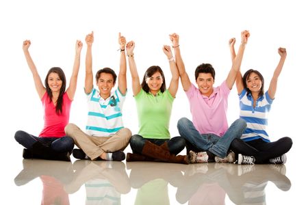 Happy group of people with arms up sitting on the floor - isolated