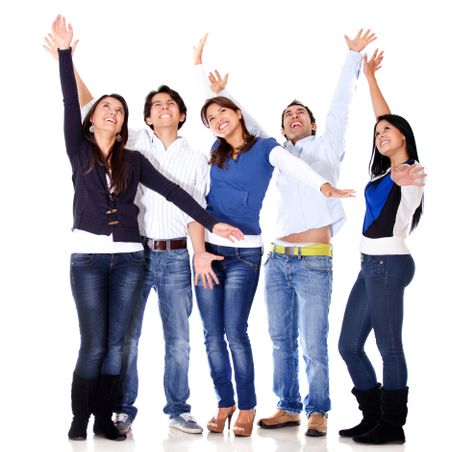 Happy group of people celebrating - isolated over a white background