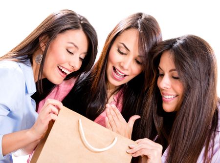 Happy group of shopping girls looking at their purchases - isolated over white