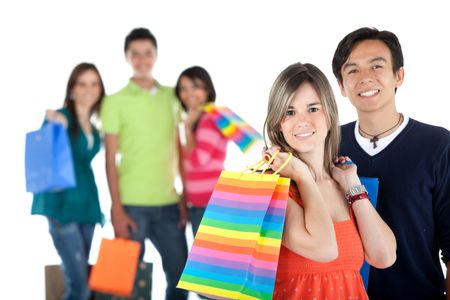 Happy group of shopping people holding bags - isolated over white
