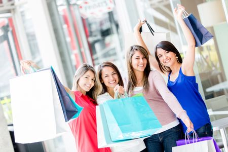 Happy group of shopping women with arms up
