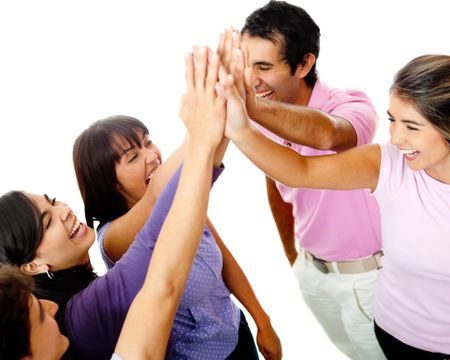Happy group of young friends giving a high-five isolated over a white background