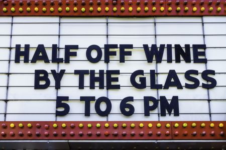 Happy hour in a tourist town: Daily bargain on wine announced on a vintage movie marquee on a main street in America