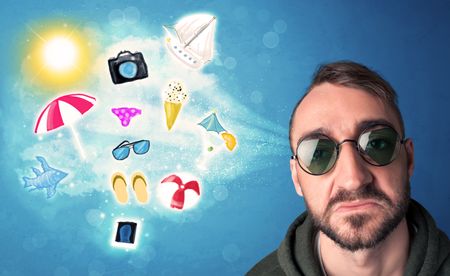 Happy joyful man with sunglasses looking at summer icons and symbols concept