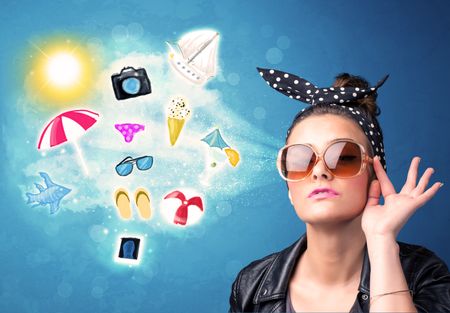 Happy joyful woman with sunglasses looking at summer icons and symbols concept