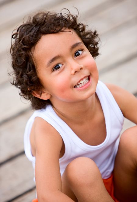 happy kid portrait smiling and sitting on a wooden deck outdoors