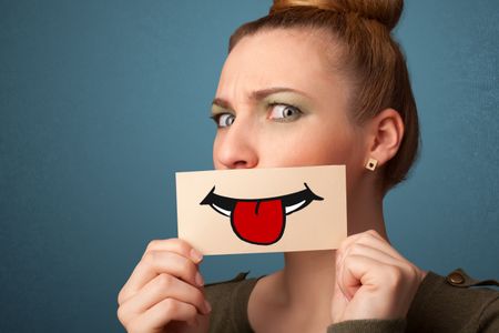 Happy pretty woman holding card with funny smiley on gradient background