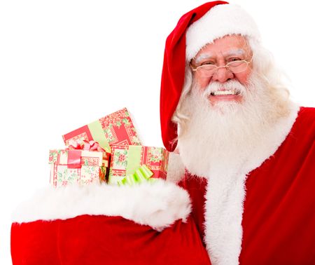 Happy Santa with Christmas gifts in a sack - isolated over white