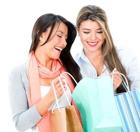 Happy shopping women looking at purchases - isolate dover white background