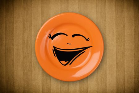 Happy smile cartoon face on colorful dish plate and grungy background