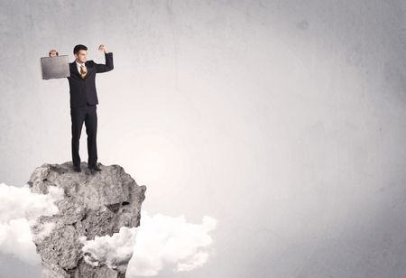 A happy successful businessman standing on a stone cliff with clouds in front of clear empty grey background concept
