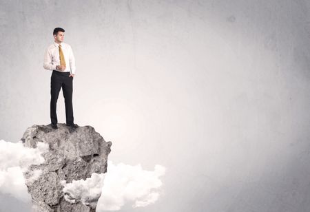 A happy successful businessman standing on a stone cliff with clouds in front of clear empty grey background concept