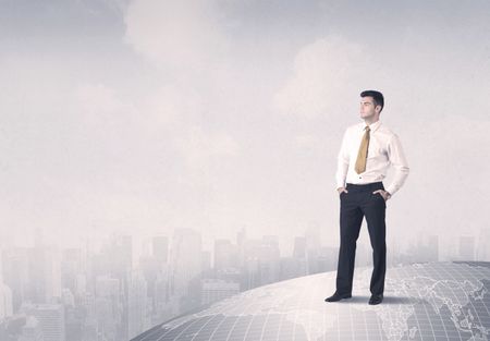 A happy, well dressed construction manager drawing with a pen and planning while standing on top of the earth concept.