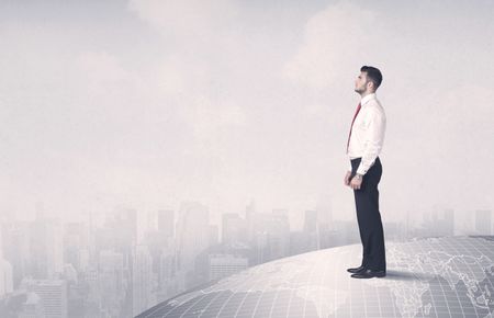 A happy, well dressed construction manager drawing with a pen and planning while standing on top of the earth concept.