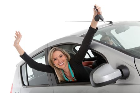 Happy woman coming from a car?s window ? isolated over a white background