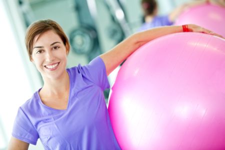 Happy woman at the gym with a pilates ball