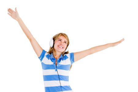 Happy woman with headphones listening to music - isolated over white