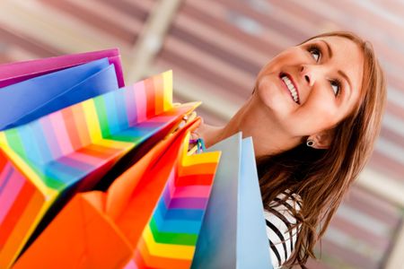 Happy woman holding shopping bags at the mall