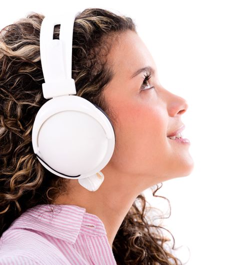 Happy woman listening to music - isolated over white background