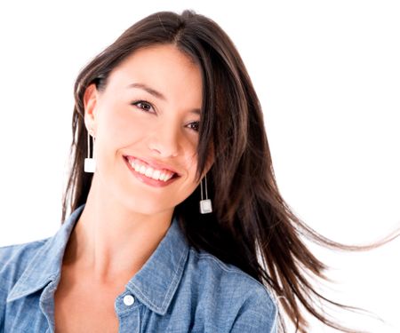 Happy woman loving her long hair - isolated over white background