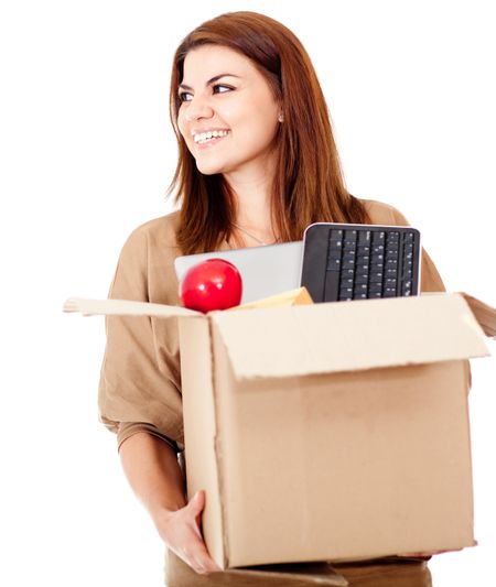 Happy woman moving house and packing - isolated over white