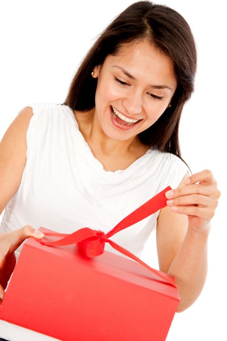 Happy woman opening a present - isolated over white