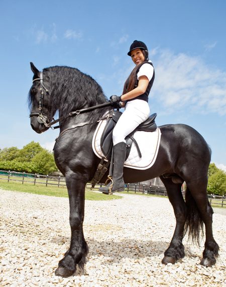 Happy woman riding a horse outdoors and smiling