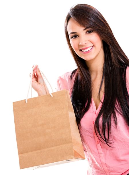 Happy woman with a shopping bag - isolated over a white background