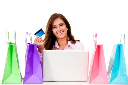 Happy woman shopping online - isolated over a white background