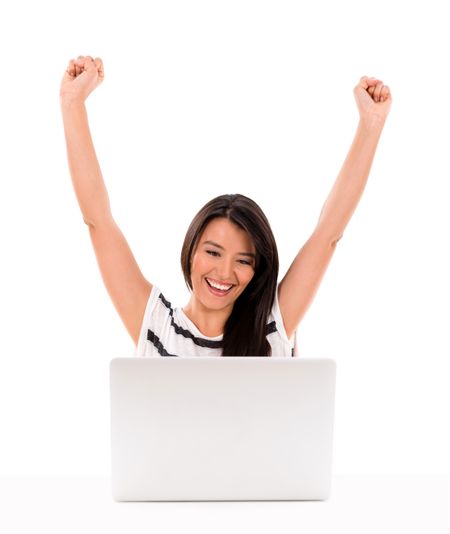 Happy woman winning something online with arms up - isolated over white