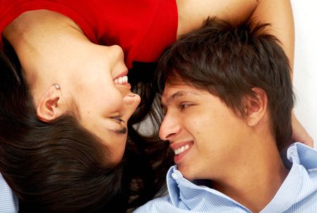 happy young couple kissing on the floor