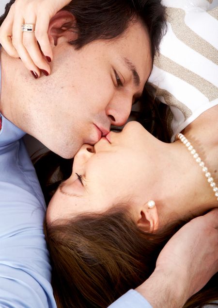 happy young couple kissing on the floor