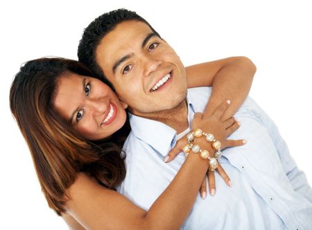 happy young couple portrait smiling isolated over a white background