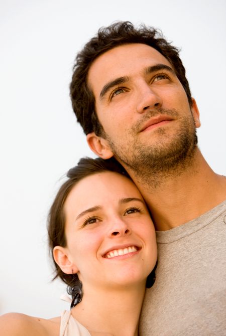 happy young couple smiling outdoors looking away