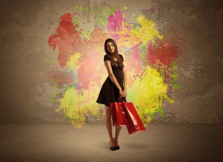 A happy young elegant woman standing with shopping bags in front of brown wall background full of colorful ink splatter concept