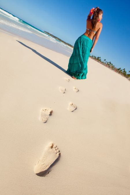 Hawaiian woman walking at the beach leaving footprints on the sand