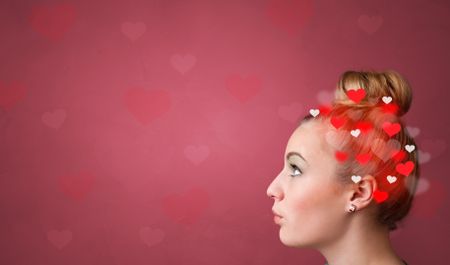 Head with full of love, red background and hearts
