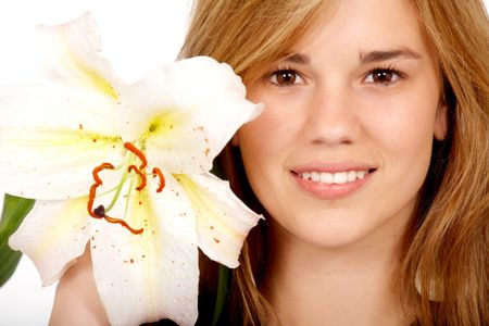 healthy blond girl smiling portrait holding a flower next to her face - isolated over a white background