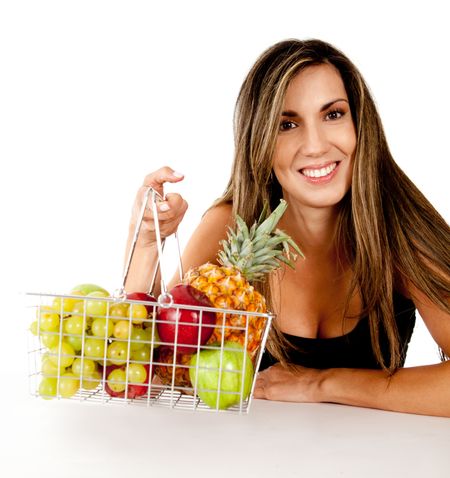 Healthy eating woman with a basket of fruits ���� isolated over white
