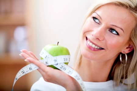 Healthy eating woman holding an apple with a measuring tape around it