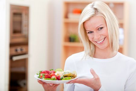 Healthy eating woman holding a fruit's tray and smiling